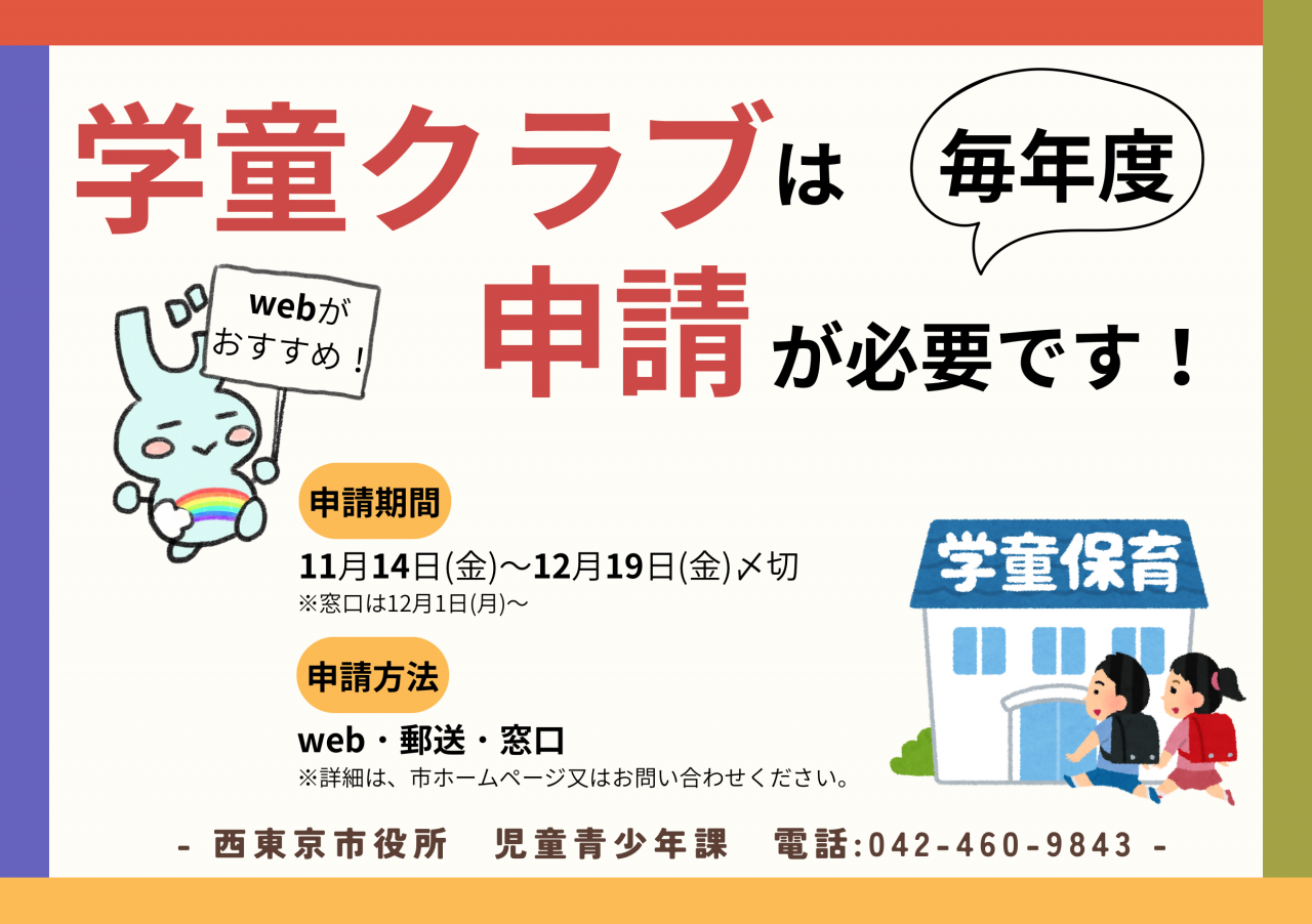 令和8年度学童クラブについて、web・郵送での入会申請を先行受付しています。